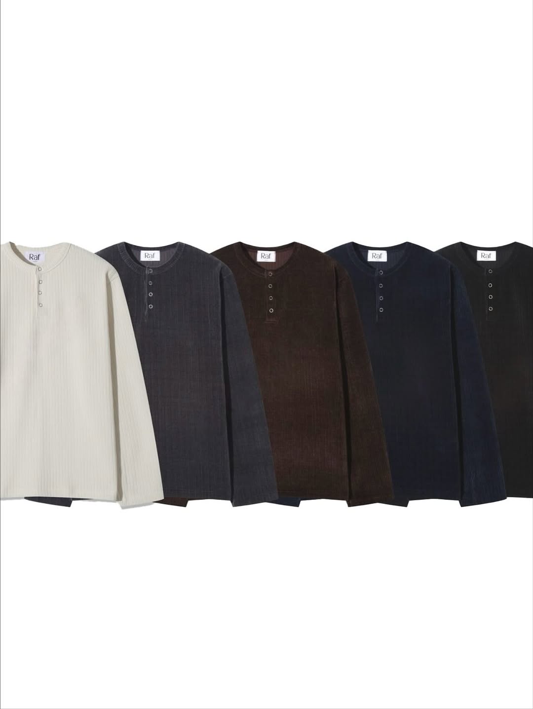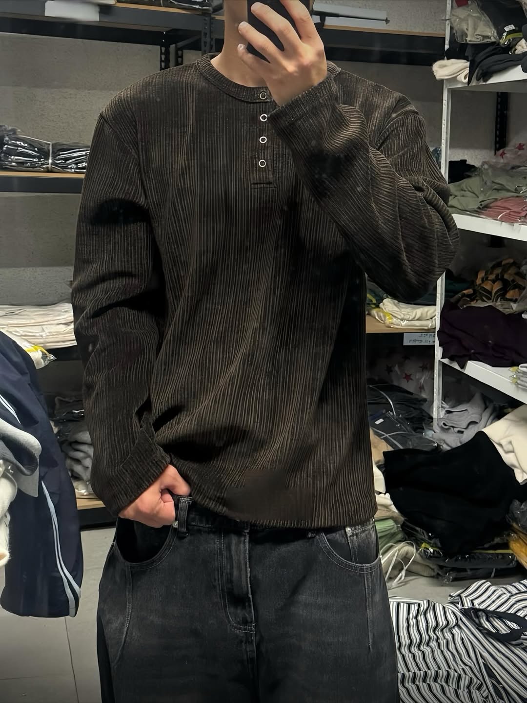 這件燈芯絨亨利領長袖上衣是韓國復古風必備單品!經典亨利領設計結合燈芯絨條紋紋理,打造復古文藝風格,無論單穿或疊穿都能展現獨特品味。